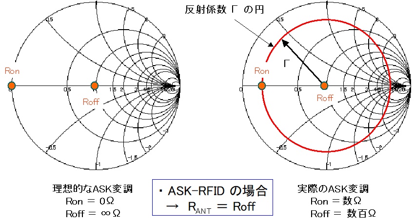 In Amplitude Shift Keying (ASK), the switch within the RFID ideally has 0Ω (ON resistance) and ∞Ω (OFF resistance). However, in actual FET switch on the RFID chip, the ON resistance is several ohms and the OFF resistance is several hundred ohms. Therefore, the antenna impedance is designed to be several hundred ohms (OFF resistance).