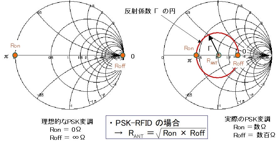 In Phase Shift Keying (PSK), the switches within the RFID ideally have 0Ω (ON resistance) and ∞Ω (OFF resistance). However, in actual FET switch on the RFID chip, the ON resistance is several ohms and the OFF resistance is several hundred ohms. Therefore, the antenna impedance is determined using the calculation formula shown below so that the amplitudes of the in-phase reflected wave and the out-of-phase reflected wave become equal.